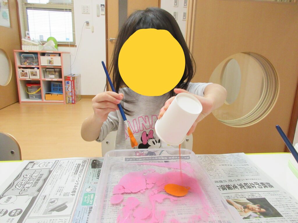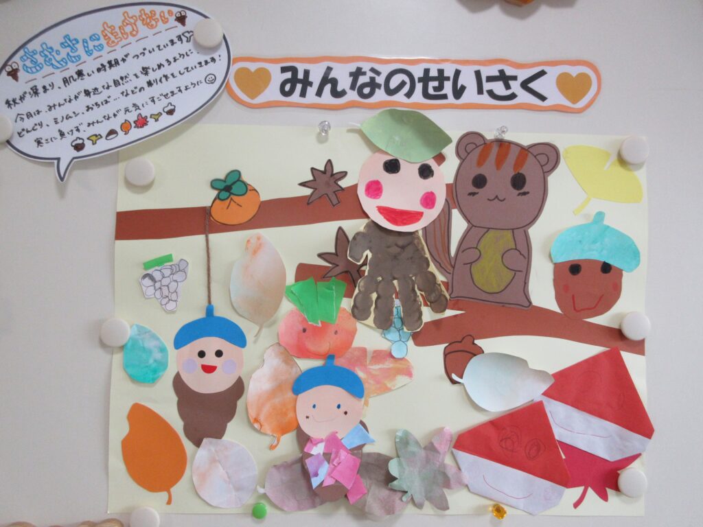 11月はどんぐり、12月はクリスマスツリーを作りました😊色を混ぜる制作では、自分の好きな色を選び、きれいにマーブリングされると大喜びでしたよ💕
